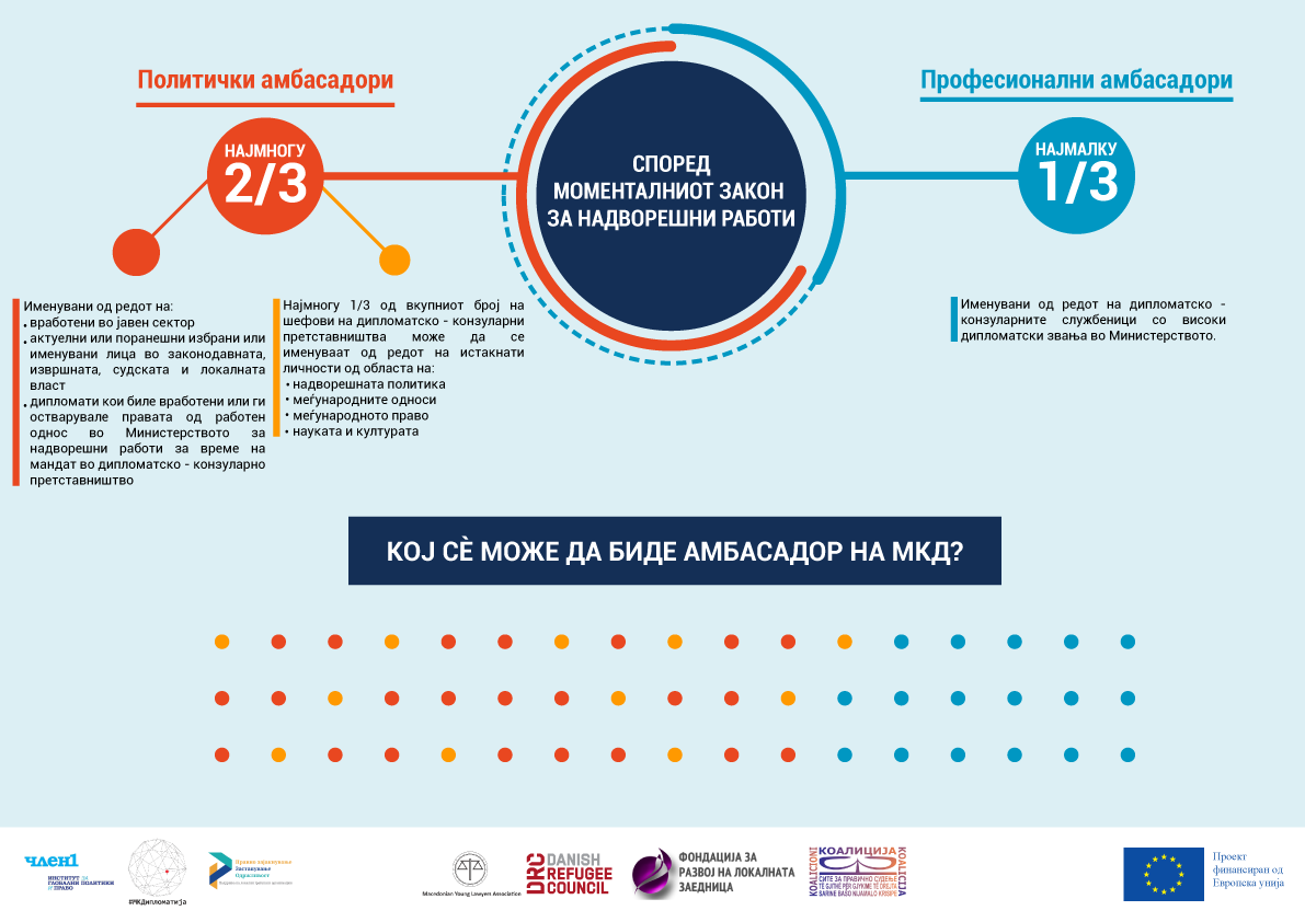 Оваа визуелизација има за цел да го прикаже соодносот меѓу тн. политички и кариерни дипломати, според моменталниот закон за надворешни работи. Ние веруваме дека овој сооднос треба да се промени, новиот закон за надворешни работи треба да ја приоретизира професионалноста на дипломатската мрежа и соодветно да го промени соодносот во законската рамка.