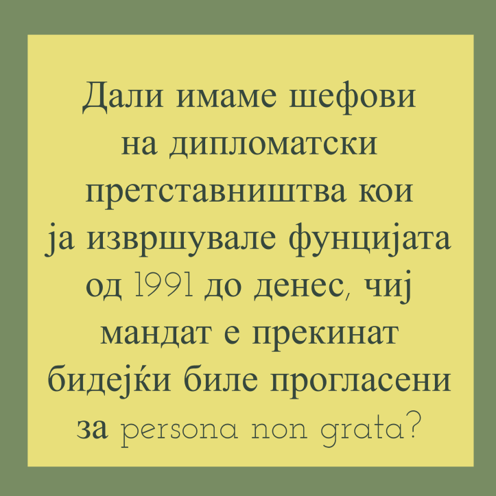 На линкот подолу ја објавуваме информацијата која Член 1 ја доби врз основа на барање за слободен пристап од информации од јавен карактер, за прашањето: дали имаме шефови на дипломатски претставништва кои извршувале функција во периодот од 1991 до денеска, а чиј мандат е прекинат бидејќи биле прогласени за persona non grata?