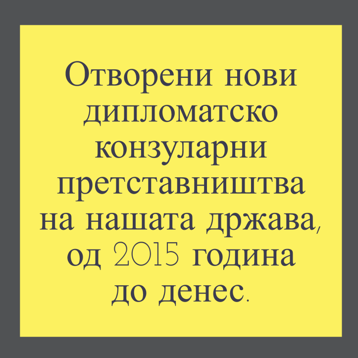 Во периодот од 2015 година до денеска, Владата донела одлука за отворање на едно ново дипломатско конзуларно претставништво. Се работи за отворање на амбасадата во Федеративна Република Бразил, со седиште во Бразилија. Одлуката е донесена во 2016 година.